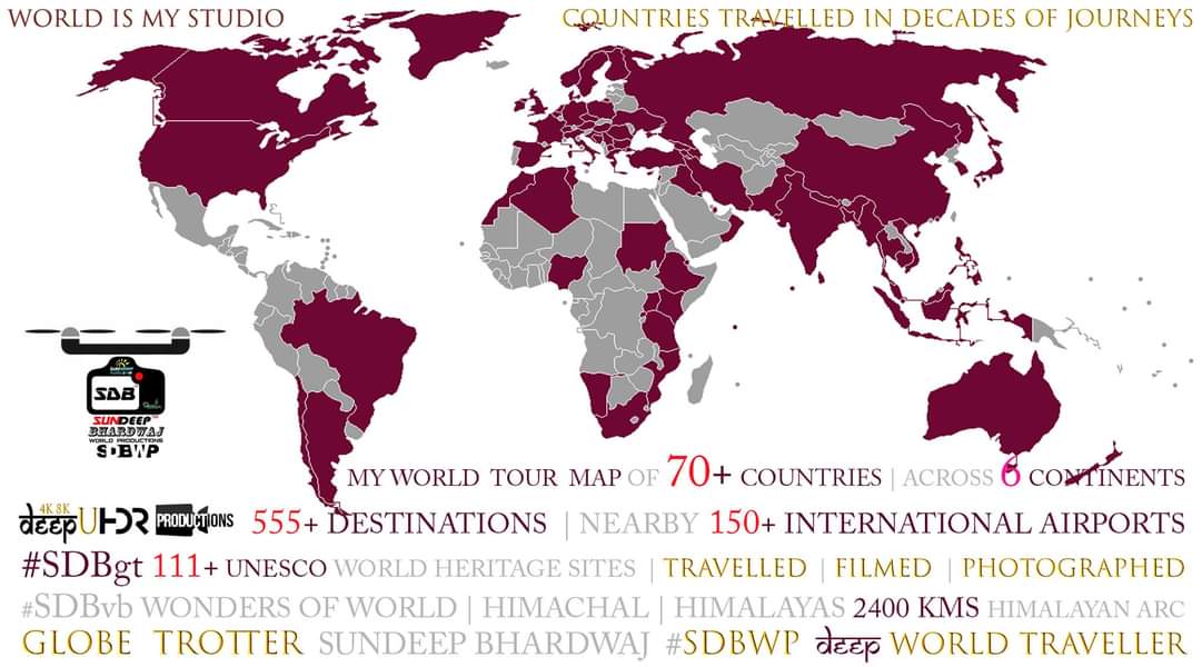 70+ Countries 555+ Destinations Across 6 Continents. Multiple Trips To 150+ International Airports 111+ UNESCO World Heritage Sites Wonders of World Himachal Himalayas Himalayan Arc 2400 kms in Decades of World Travels. 80 Lakh Kms Global Journey By Various Modes of Transportation to National Central Capital Regions of 70+ Countries , Megapols , Metropolitan Cities & Heritage Towns.